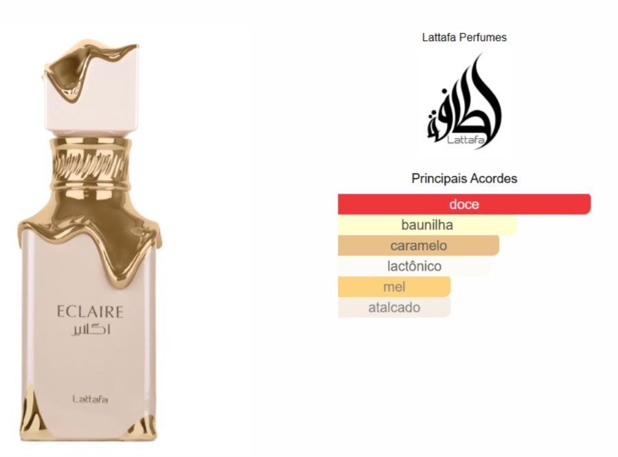 Eclaire de Lattafa Perfumes é um perfume Floral Frutado Gourmet Feminino. Esta é uma nova fragrância. Eclaire foi lançada em 2024. As notas de topo são: Caramelo, Leite e Açúcar. As notas de coração são: Mel e Flores Brancas. As notas de fundo são: Baunilha, Pralinê e Almíscar.